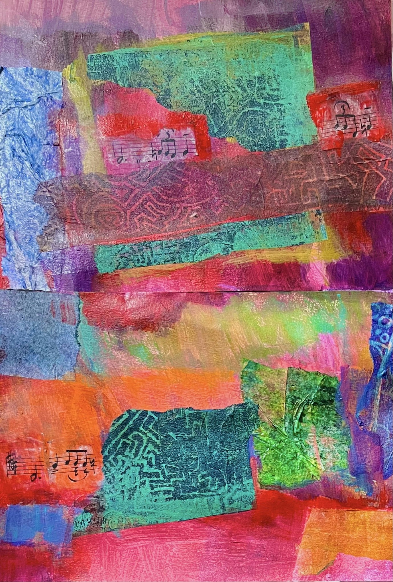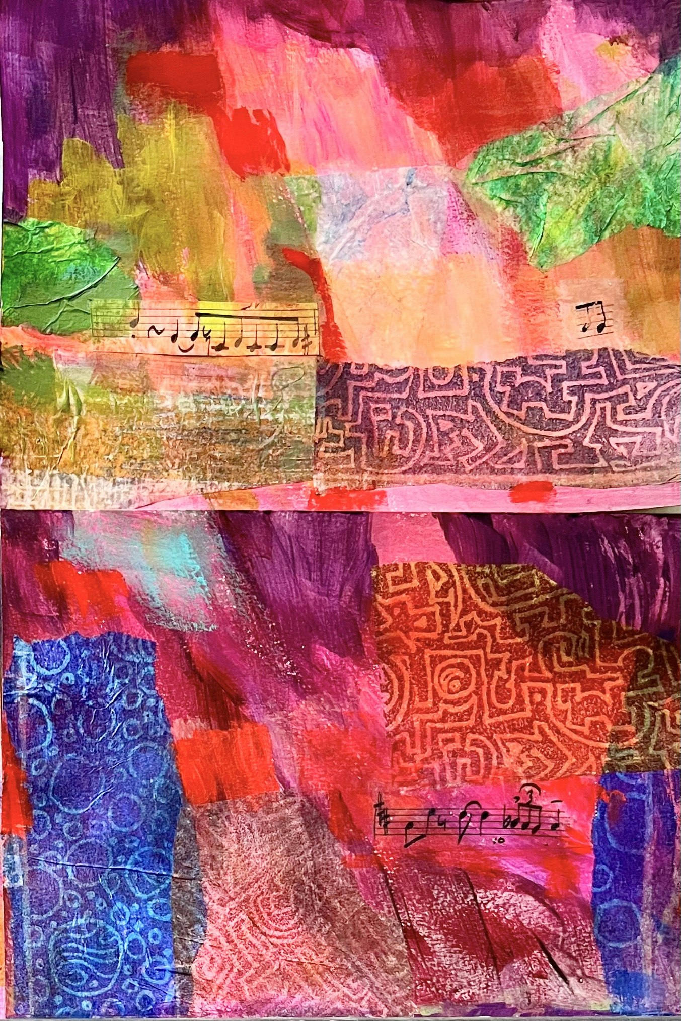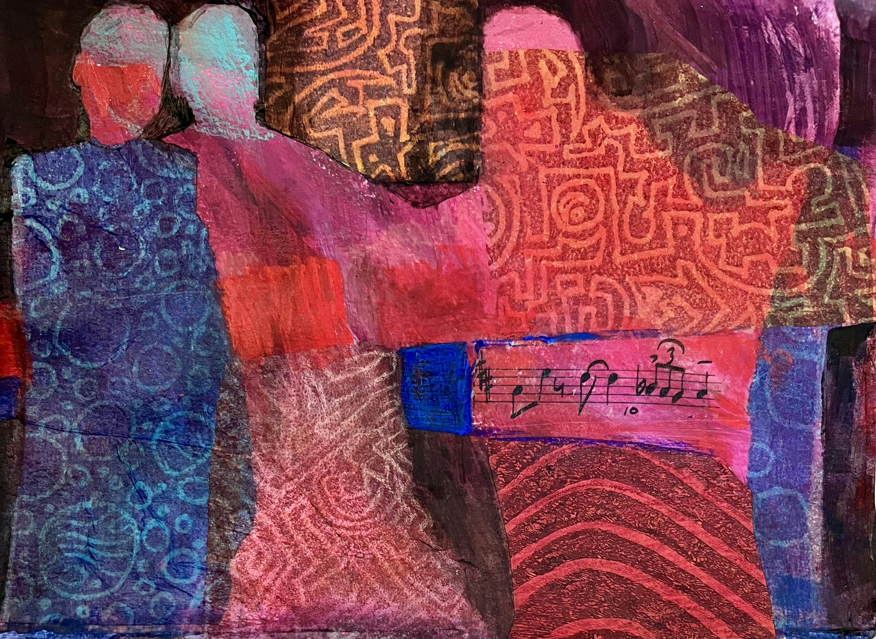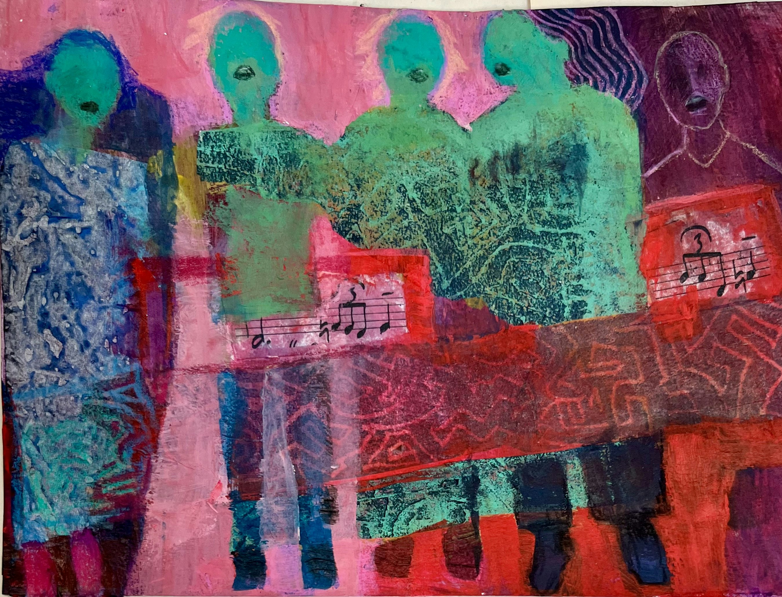 Wow... feels like something just clicked. Two days ago I started four abstract textured backgrounds with paint and patterned collage. I'd created the textures myself with scratch foam printed on both transparent and opaque papers. Then I started outlining some human figures... still wondering what they were doing... and decided the theme is music. I can't think of any other theme better fitting for me other than art. So began drawing people singing... vocal ensembles! omg I love these!
