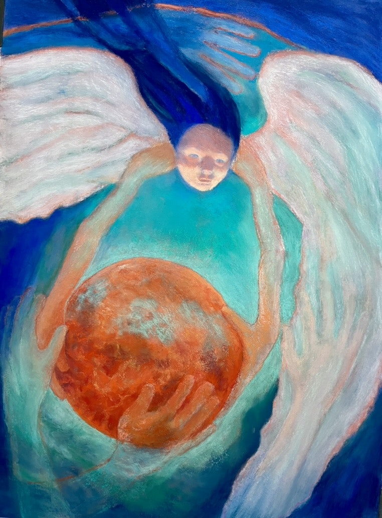 The pieces are titled Convergence, mixed media collage painting, 20x20" and Astraea, pastels on sanded paper, 30x22"