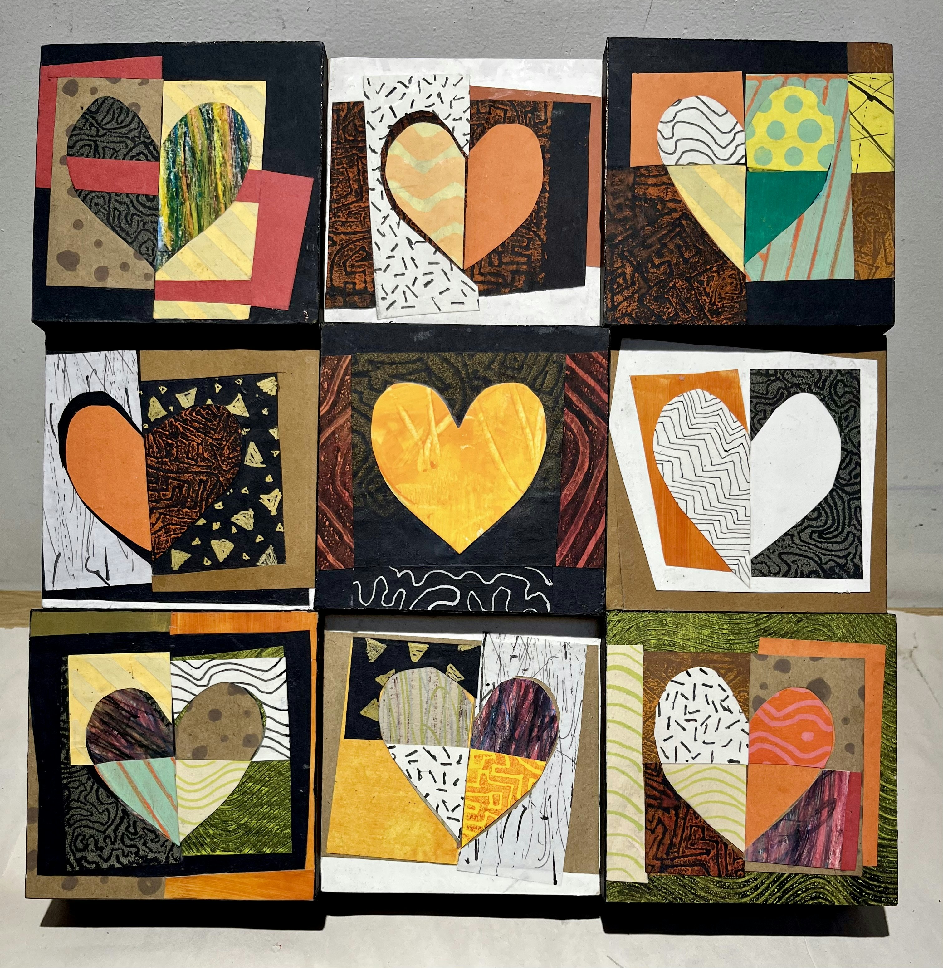 I ended up mounting the smaller 4" full and half heart designs on 4" wood blocks, then staggering 1/2" and 3/4" heights on a 12" cradled panel. I mounted the 6" quarter hearts directly on a 12" panel and like that result better.